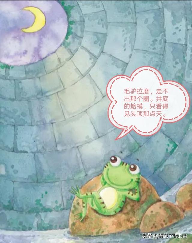 一只青蛙整天呆在井里,在它的认知中天空也不过像井底那么大。直到一夭海龟要带它去东海,它竟然不知道东海是什么。如今人们用井底之蛙来比喻那些没见过世面,满足于现状的人。