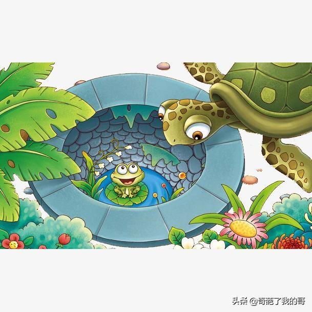 井里住着一只青蛙。它以为井就是整个世界,因此对井外的一切一无所知。有一天,青蛙碰到了一只从海里来的大海龟。青蛙自豪地对海龟夸口说:“你看,我住在这里多快乐!有时高兴了,就在井边跳跃一阵;疲倦了,就回到井里,在砖洞边休息。”