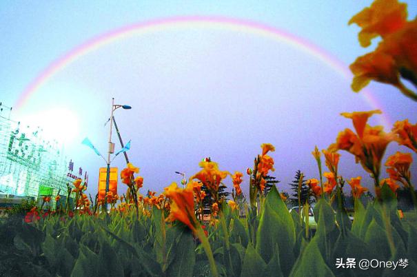 8、雨后的阳光格外明媚,一道彩虹横在蔚蓝的天空上,仿佛在向大地微笑。