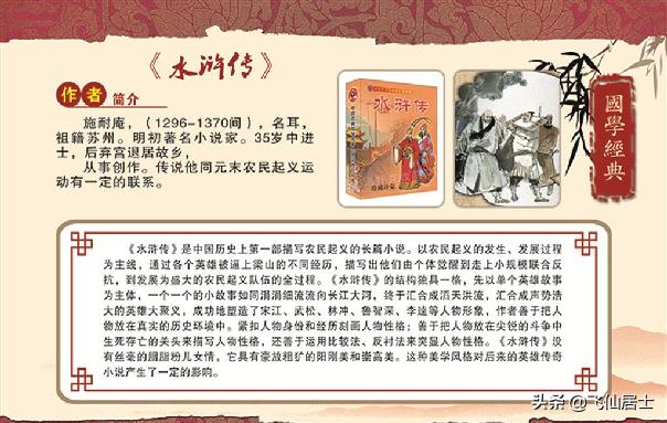 《水浒传》,中国四大名著之一,是一部以北宋末年宋江起义为主要故事背景、类型上属于英雄传奇的章回体长篇小说。
